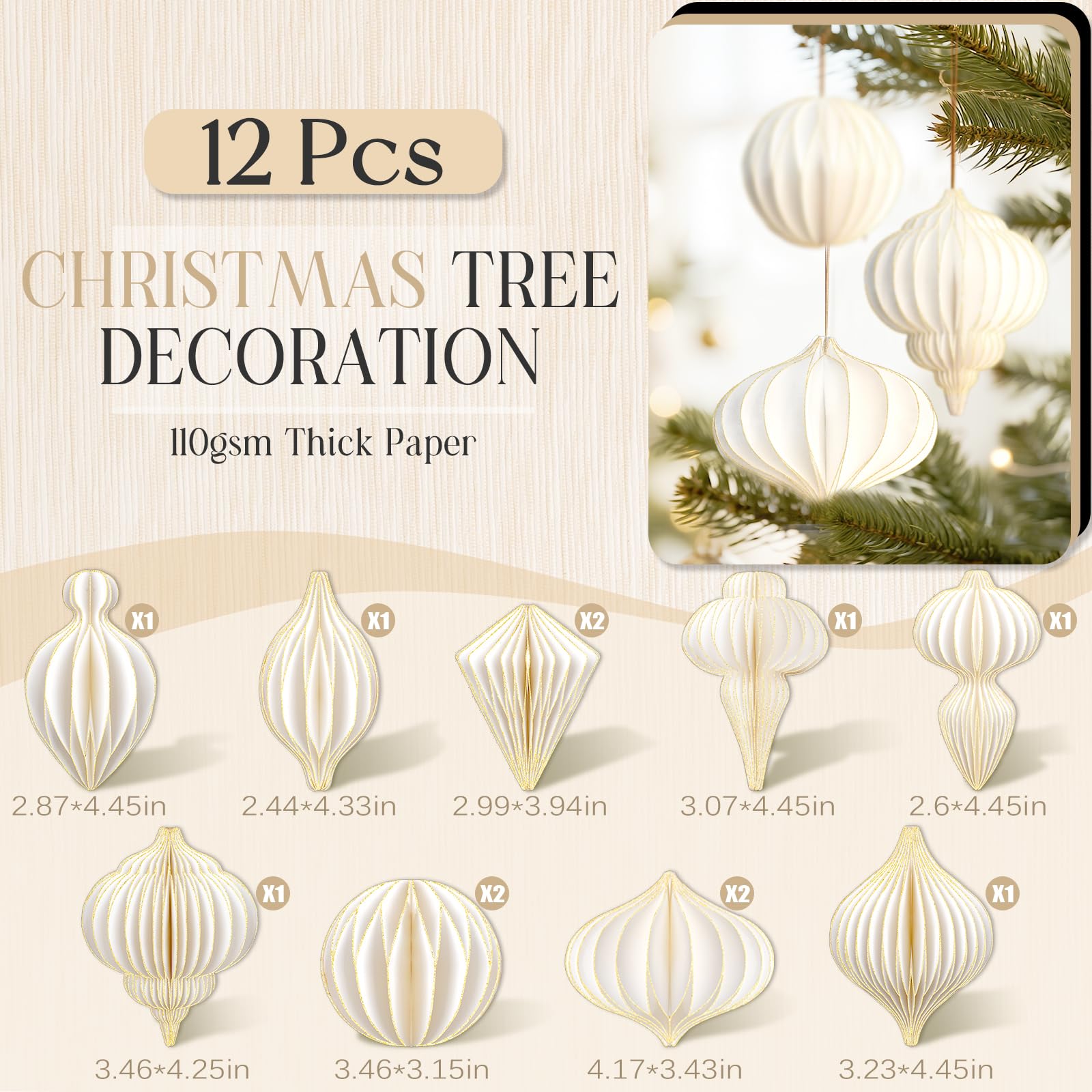 - Christmas Honeycomb Ornaments Set: You’ll receive 12pcs 3D honeycomb paper ornaments for christmas tree in classic white color, featuring 9 unique shapes and pre-attached hanging strings. This white christmas ornaments set brings nostalgic holiday cheer and vibrant color to your Christmas tree, windows, and festive displays