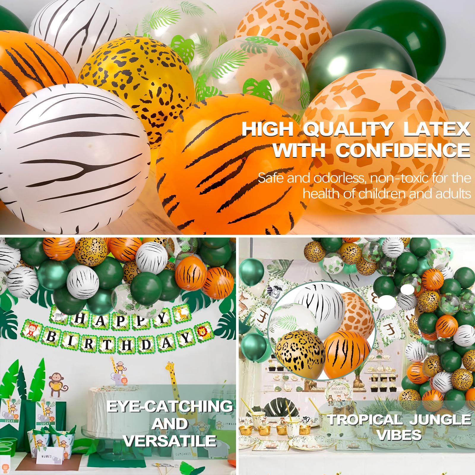 - Tropical Jungle Vibes: The balloons feature lively animal prints and vibrant jungle designs such as tiger, leopard, zebra and palm leaves, which are sure to captivate guests and create an exciting environment for children and adults alike.